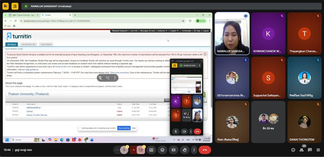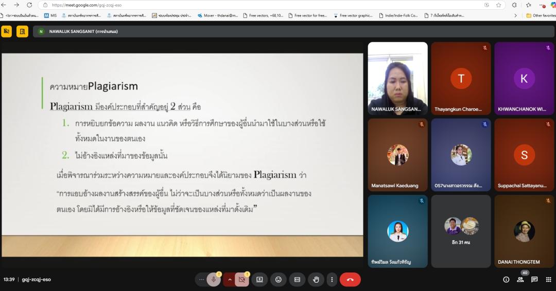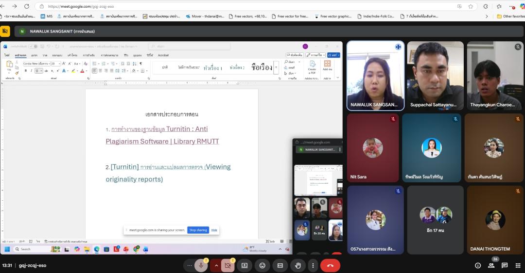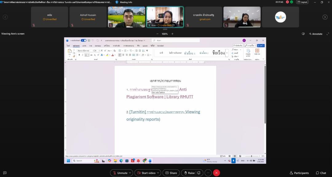 การอบรมครั้งนี้มีนางสาวเนาวลักษณ์ แสงสนิท  กวิชาชีพสารสนเทศ ระดับชำนาญการ หัวหน้ากลุ่มภารกิจทรัพยากรการเรียนรู้และสารสนเทศ พร้อมด้วยทีมบุคลากรของสถาบันทรัพยากรการเรียนรู้และเทคโนโลยีดิจิทัล ทำหน้าที่เป็นวิทยากรถ่ายทอดความรู้เกี่ยวกับการใช้งานระบบ Turnitin อย่างถูกต้องตามหลักวิชาการ การวิเคราะห์รายงานผลการตรวจสอบผลงาน รวมถึงการแนะนำเครื่องมือและโปรแกรมดิจิทัลที่ช่วยสนับสนุนการทำวิจัย การเขียนผลงานทางวิชาการ และการจัดการข้อมูลวิจัยของคณาจารย์และนิสิตระดับบัณฑิตศึกษาอย่างเป็นระบบ