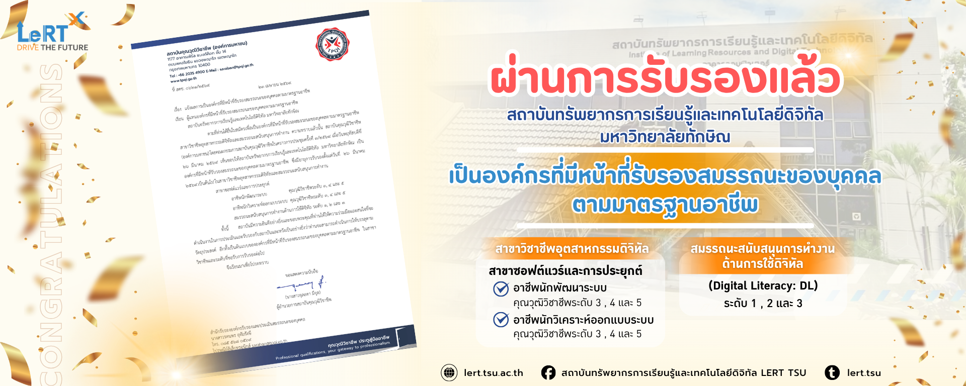 สถาบันทรัพยากรการเรียนรู้และเทคโนโลยีดิจิทัล มหาวิทยาลัยทักษิณ ผ่านการรับรองเป็นองค์กรที่มีหน้าที่รับรองสมรรถนะของบุคคลตามมาตรฐานอาชีพ