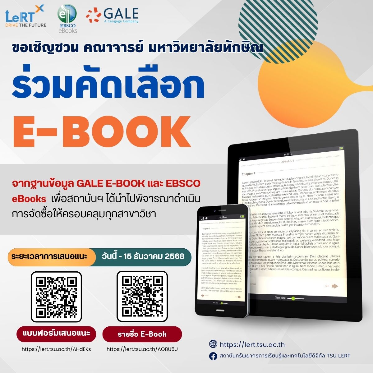 ขอเชิญชวน คณาจารย์ มหาวิทยาลัยทักษิณ ร่วมคัดเลือก  E-BOOK จากฐานข้อมูล GALE E-Book และ EBSCO eBooks