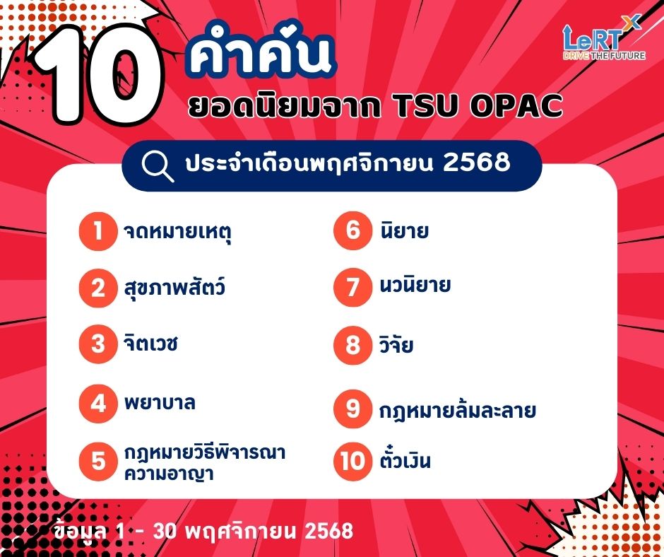 เผยคำค้นสุดฮิต ของผู้ใช้บริการสืบค้นทรัพยากรฯ ผ่านระบบ TSU OPAC ค้นหาอะไรบ้าง ประจำเดือนพฤศจิกายน 2568